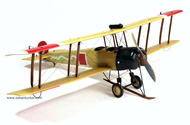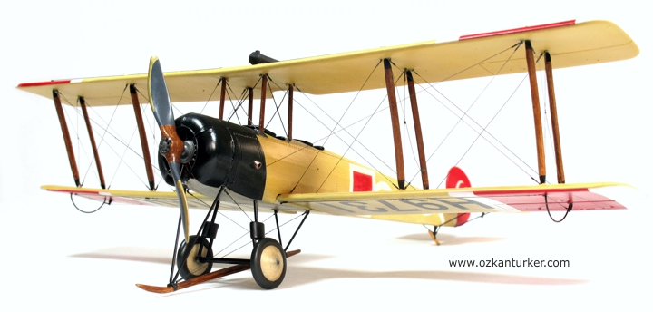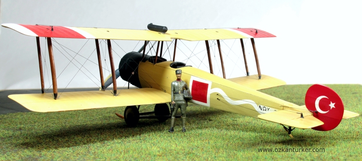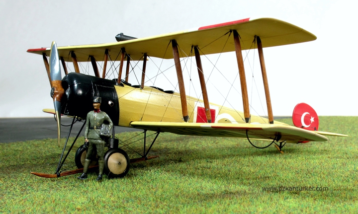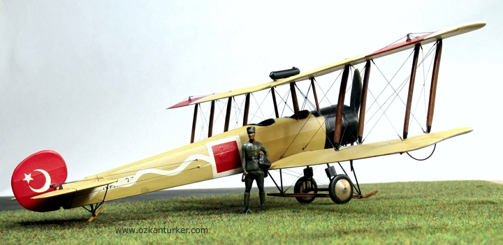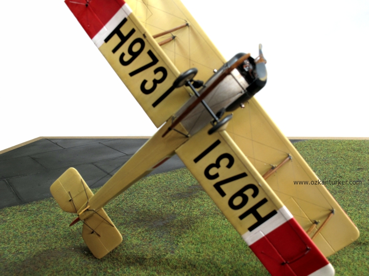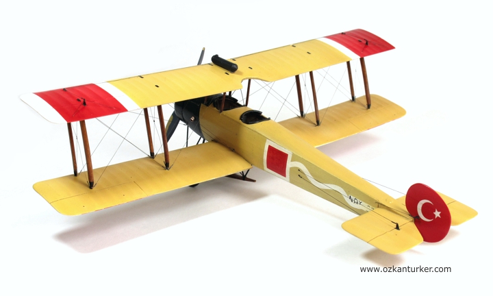 Boyalar kuruyadursun Avro 504'lerin Türk Hava Kuvvetleri'ndeki hikayesine biraz değineyim : Kurtuluş Savaşı döneminde Anadolu'da bulunan Yunan işgal kuvvetlerinin bünyesindeki deniz havacıları Avro 504K tipi uçakları da kullanıyordu. Askeri bir değeri olmamakla beraber bu uçaklar eğitim ve/veya keşif hizmetleri için görev almış olabilirler. Bu uçaklardan birisi Mayıs 1920'de yön kaybı nedeniyle yakıtı bittiği için Çine'ye mecburi iniş yaptı. Personeli esir alınan uçak Yüzbaşı Fazıl ve makinist Eşref tarafından uçurularak Afyon'a getirildi. Motor verimi düşük olan bu uçak harp görevi yapabilecek özellikte olmadığı anlaşılınca bir süre eğitim için kullanıldı. Sivil pilot İhya'nın eğitim uçuşu sırasında kırım geçiren uçak hizmetten çıktı. Bildiğim kadarı ile bu uçağa ait fotoğraf bulunmuyor. Hava kuvvetlerinde kullanılan ikinci Avro 504K ise İzmir'in kurtuluşu ile Gaziemir meydanında sağlam olarak ele geçirildi. Bu uçak da eğitim için kullanılırken 23 Kasım 1922 günü kırım yaptı. Bu kazada sözleşmeli Fransız eğitmen pilot Teğmen Ismérie ve sivil makinist Mazlum Peksoy hayatını kaybetti. Uçağın kaza sonrasına ait bir fotoğrafı bulunuyor. Ben de bu fotoğrafı kaynak alarak modeli boyadım. Milliyet işaretleri, kanat altı numalarları, gövde yanında bulunan Yunan seri numaraları ve dalgalı şerit maskelenerek boyandı.