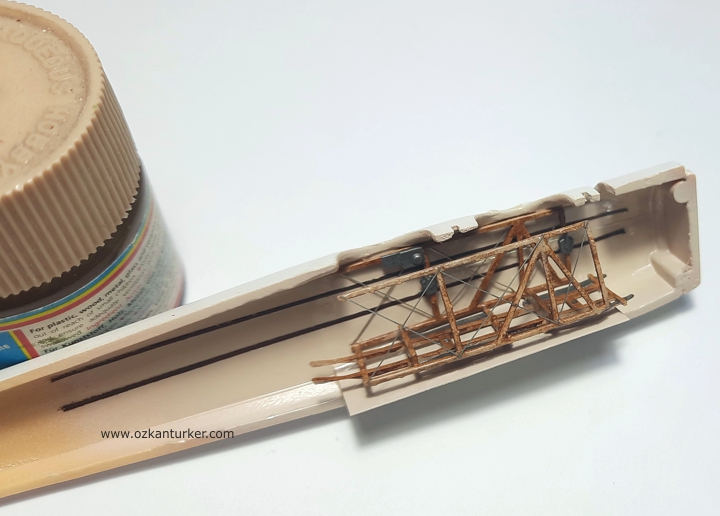 Boyama işlerinin tamamlanmasının ardından montaj aşamasına geçtim. Bu süreç tahminimden daha uzun zaman aldı. Oniki dikmenin ayarlanması modelin en uzun ve sabır isteyen kısmı oldu. Kumanda ve gergi telleri de birkaç günlük çalışmayla tamamlandı. Diğer detayların da tamamlanmasının ardından modeli yarı mat vernik atarak tamamladım. Hepimize geçmiş olsun. Bu özellikte birkaç modelim daha var, hatta birisi tezgahta bitmemek için direniyor. Araya kolay bitecek modeller alarak ilerliyorum. Bakalım sinir harbini kim kazanacak ? İyi modeller Özkan Türker Ekim 2025