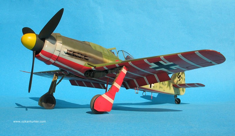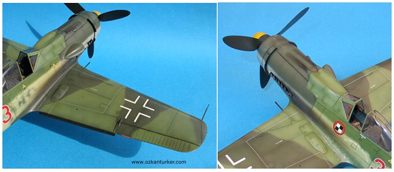 Üst kısımlar boyandıktan sonra gerekli maskelemeleri yaparak alt kısımları Luftwaffe kırmızısına kavuşturdum. Bu renk için düz bir kırmızı önerilmiyor. Bu ton kırmızıdan hafifçe gül kurusuna doğru meyil etmekte. Son olarak gövde yanındaki beneksi kısımlar referansa sadık kalmaya özen gösterilerek maskesiz olarak uygulandı.