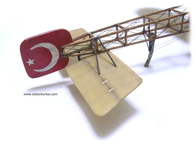 Bütün temel parçaların yapımı bittikten sonra sıra kanat ve dümenlerin yerlerine takılmasına geldi. Yerleri önceden hazır olduğu için montaj kolaylıkla yapıldı. Ancak dümenlerin ve kanatların gergi, destek ve kumanda telleri oldukça zaman aldı Bu teller için yine 0.15 misina kullanıldı. Bütün teller çekildikten sonra gunmetal renkte boyandı. Model tamamlandığında, araştırma ve hazırlık aşamalarını hesaba katmazsak yaklaşık iki yüz saatlik bir çalışma zamanı harcamıştım ve modeli oluşturan toplam 550 parça için ölçme, kesme, boya ve yapıştırma yapmıştım. Zaman içinde muhtelif kaynaklardan elime ulaşan çizim ve fotografların ışığında özellikle ön kokpit içindeki bazı ilaveleri (pusula,devir saati,yakıt pompası ) yaptım . Özkan Türker © 2001