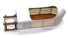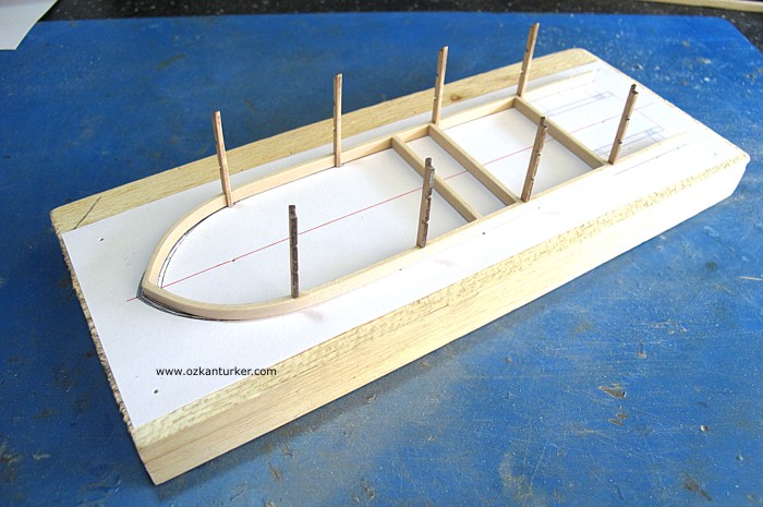 Narin gövde iskeletinin yapımında tahta şablon üzerine ıslatılarak lamine edilen balsa çıta kullandım. Hafifçe nemlendirilmiş çıtalar istenilen eğimi alacak şekilde birbiri üzerine yapıştırılarak kurutuldu. Ara dikme çıtaları lazerde kesilerek önceden şekil verilen bu çıtaların üzerine ilave edildi. İskeletin dağılmaması için geçici bir kalıp üstüne yerleştirdim. Gövdenin üst kısmını kaplayan metal kaportayı vakum ile şekillendirmek için yine balsa takozdan kalıp hazırladım. Şekillendirilen plastik kaportanın yerine alıştırılmasından sonra yan kaplamalar için kağıt bant kullandım. Kağıt bant bez kaplama etkisini veriyor ancak sağlamlaştırılması gerekiyor. Bu sebeple üzerine laminasyon epoksi sürülerek sertleşmesini sağladım. Zemin kaplaması olarak konraplak deseni basılmış fotoğraf kağıdı kullandım. Mat vernik uygulayınca sonuçtan memnun kaldım . Motor yatağının takviye metal parçalarını sarı metal levhadan FeCl³ (Demir-üç-klorür) marifetiyle imal ettim.