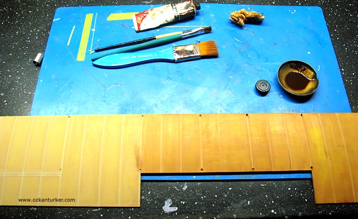 Kanat ve dümenlerin boyanmasında Tamiya akrilik boya kullandım. Beyaz, sarı ve krem tonlarından oluşan menü ile ortaya karışık serbest çalışma yaptım. Kanat sinirlerin olduğu yerler açık tonda olacak şekilde bir kaç karışım ile boyama işlemi bitince tamamını sentetik tiner ile inceltilmiş yağlı boya ile sildim.