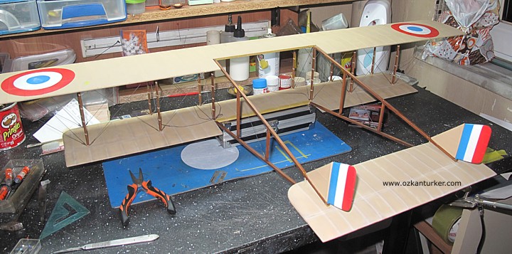 Kanat gergilerini takiben üst ve alt kanadın kalan kaplama de detaylarına sıra geldi. Aynı yöntemle kaplamayı ve boyamasını tamamladıktan sonra kanat ve dümenlerdeki Fransız milliyet işaretlerini de maskeleyerek boyadım.