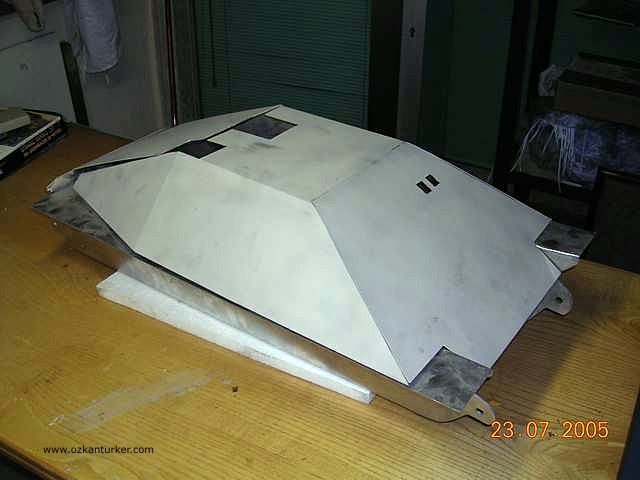 Taret (yada top zırhı desek daha mı doğru) kısmı da prototip makinasında üretildi . Yerine yapıştırıldıktan sonra çelik macun ve zımpara işlemi ile düzgün bir şekil verildi ve üst plakası yerleştirildi. Daha sonra döküm metal görüntüsü vermesi için elden geçirilecek.