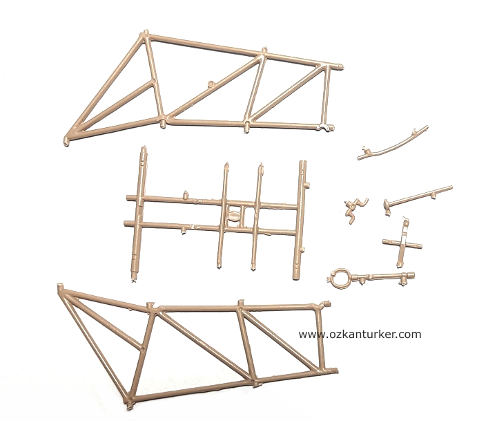 Kokpit iskeletini oluşturan parçaları biraraya getirerek model başladım. Görüldüğü üzere temizlenmesi gereken bol miktarda yolluk, itici pim izleri ve çapak mevcut. Ayrıca kullandıkları plastik sanırım çok kaliteli bir karışım değil. Gereksiz kırılma veya çatlamalar olabiliyor.