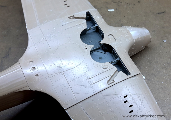 Orta kanat tesviye ile düzelttiğim halde yerine oturmamakta ısrarcı oldu. Bunun nedeni kanat içindeki resin iniş takım yuvasının kalın olmasından kaynaklandığını anladım. Döküm parça yüksek olduğu için kokpite dayanıyor ve oturmuyordu. İşin kötü tarafı bu kısmı neredeyse kağıt kalınlığında bir duvar bırakana kadar inceltmeme rağmen yine de oturmadı.
