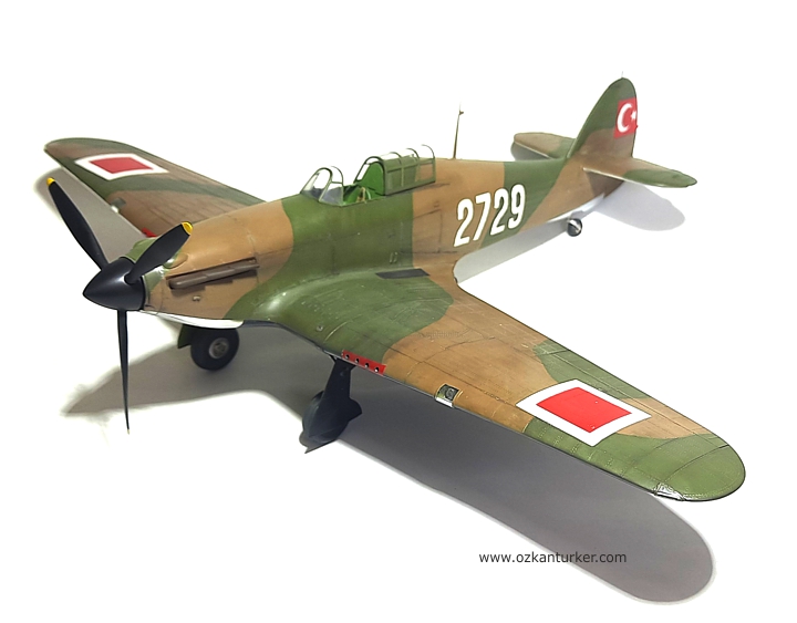 Kanat montajı devam ederken arada gövde altındaki yağ soğutucu ile biraz uğraştım. Dört parçadan oluşan soğutucu filitresi modele oldukça güzel bir detay katıyor ancak bu parçaların yerine oturması için freze ile bir miktar inceltme yapmak gerekti. Montaj aşamasının sonlarına doğru dikey dümenin uç kısmında da bir düzeltme yapmak gerekli oldu. Dümenin ucu biraz kısa ve küt olduğu için sabit dikmeye göre biraz dengesiz görünüyordu. Buraya da ufak bir parça ile ilave yaparak tekrar şekil verdim. Montaj kısmının tamamlanmasıyla tesviye işleriyle epeyce tozlanıp kirlenen modeli güzelce yıkayıp kurumak üzere bir kenara bırakarak boya hazırlığına geçtim. Türk Hava Kuvvetlerinde Türk Hava Kuvvetleri için 1939 yılında sipariş edilen 15 adet Hurricane Mk.I teknik aksaklıklar sebebiyle Eylül 1939 tarihinde gönderildi. Bunu 1940 yılında teslim edilen 15 adetlik ikinci parti takip etti. 1943 yılında gönderilen beş uçak ile Hava Kuvvetleri envanterine giren Hurricane Mk.I sayısı 35 oldu. Bu uçakların bir kısmı Alman işgali nedeniyle Polonya'ya teslim edilemeyen uçaklardan oluştu. Gelen uçaklar 4. Alay bünyesinde önce Çorlu'da daha sonra Merzifon'da 1945 yılına kadar av eğitim uçağı olarak görev yaptı. Elimdeki Hurricane Mk.I fotoğraflarını incelediğimde uçağın üst kamuflajı standart RAF gündüz av uçağı boyaması olan koyu yeşil/koyu toprak olduğu görülüyor. Uçaklar bu renklerle uygulanan A ve B şema ile boyanmış . Alt renk konusunda ise biraz çeşitlilik bulunuyor. Uçakların bazılarının altı Sky olarak tanımlanmış mavi ile boyanmışken bazılarının da siyah (aslında tam siyah değil ama neyse) ve beyaz simetrik kanat boyamasına sahip. Bu durum uçakların üretim hattından seri olarak değil de sanki çeşitli birliklerden toplanarak gönderildiği izlenimi veriyor. Bu uçaklardan bir tanesini yapmak için fotoğrafları incelerken muhtemelen hafta sonu eşleriyle bir hatıra pozu vermiş pilotların olduğu karede dikkatimi bir detay çekti. Nedense bu tür hoş ayrıntılar kıyıda köşede tesadüfen kareye giren uçaklarda oluyor. Arka planda görülen 2729 numaralı Mk.I'in dümen boyaması diğerlerinden farklılık gösteriyordu. Kırmızı kuyruk dümeni üzerine ay-yıldız uygulamasından sabit dikme üzerinde standart bayrak kullanılmasına geçene kadarki ara bir dönemde bayrak formunda boyanmış dümen uygulamasını Spitfire Mk.V, Fw-190, Oxford, B-24 ve Master gibi dönem uçaklarda görmüş olsam da Hurricane'de ilk defa rastladım. Demek ki onda da varmış. Bu durumda bu ilginç boyamayı yapmamak olmaz diyerek maskeleri hazırladım.