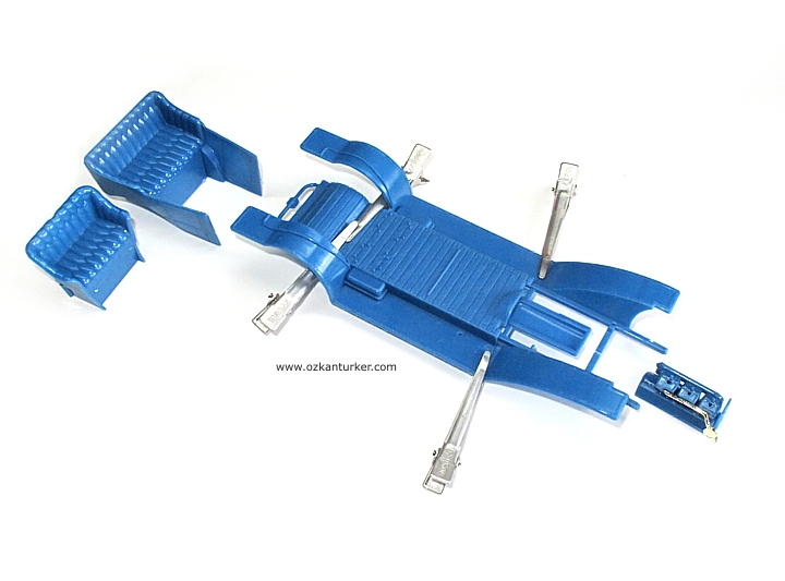 Modelimiz Pyro tarafından üretilmiş . Pyro 50'li yılların başlarında üretime geçmiş plastik model dünyasının efsanevi markalarından birisi. Gemi ve otomobil modelleri başta olmak üzere, uçak, figür ve hayvanlar aleminden pek çok model üretmiş. Ürettiği modeller dönemine göre oldukça detaylı ve doğru kabul edilebilir. Yapmak üzere tezgaha gelen bu modelin üretim yılı 1967. Benimle aynı yaşta... Kutu içersinde mavi plastikten üretilmiş ana parçalara ilave olarak, altın krom kaplama ve şeffaf parçalar da mevcut. Lastikler ise yumuşak plastik ve aradan geçen uzun yılların bir etkisiyle biraz bozulmaya meyilli. Yapım kılavuzu ise düğün davetiyesi kıvamında ve bütün parçalar ve yapım aşamaları iki şema içine yerleşmiş. Bu nedenle ortalık biraz karışık. Parçalar oldukça temiz, itici izlerinin haricinde çapak neredeyse yok gibi. Elli yıl önceki üretim teknolojisine insan şaşırıyor.