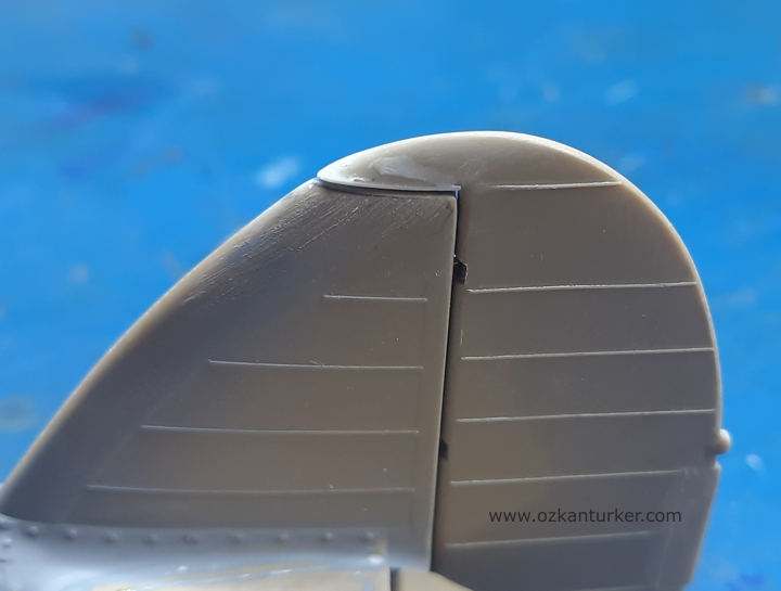 Bu kısımda yapabileceğim başka birşey kalmayınca kokpit iskeletinin alt kısmındaki bir bölümü kesmek zorunda kaldım. Yukarıdan bakıldığında görünmeyen bu kısmı kesince orta kanat nihayet yerine oturdu. Alt kanadın oturmasıyla kalan boşluklar macun, tesviye düzeltmelerinin ardından bir astar atarak kontrol edildi. Kanat birleşme yerleri için verilmiş metal parçaları yerine yapıştırınca bu kısımda göze batan ufak düzensizlikler tamamen kayboldu.