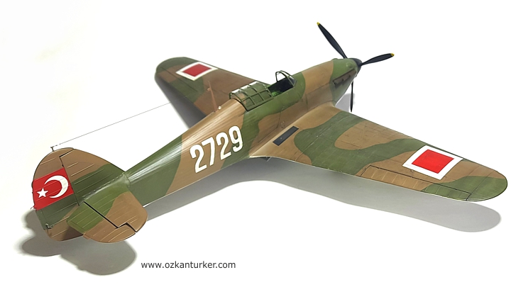 Kanat montajı devam ederken arada gövde altındaki yağ soğutucu ile biraz uğraştım. Dört parçadan oluşan soğutucu filitresi modele oldukça güzel bir detay katıyor ancak bu parçaların yerine oturması için freze ile bir miktar inceltme yapmak gerekti. Montaj aşamasının sonlarına doğru dikey dümenin uç kısmında da bir düzeltme yapmak gerekli oldu. Dümenin ucu biraz kısa ve küt olduğu için sabit dikmeye göre biraz dengesiz görünüyordu. Buraya da ufak bir parça ile ilave yaparak tekrar şekil verdim. Montaj kısmının tamamlanmasıyla tesviye işleriyle epeyce tozlanıp kirlenen modeli güzelce yıkayıp kurumak üzere bir kenara bırakarak boya hazırlığına geçtim. Türk Hava Kuvvetlerinde Türk Hava Kuvvetleri için 1939 yılında sipariş edilen 15 adet Hurricane Mk.I teknik aksaklıklar sebebiyle Eylül 1939 tarihinde gönderildi. Bunu 1940 yılında teslim edilen 15 adetlik ikinci parti takip etti. 1943 yılında gönderilen beş uçak ile Hava Kuvvetleri envanterine giren Hurricane Mk.I sayısı 35 oldu. Bu uçakların bir kısmı Alman işgali nedeniyle Polonya'ya teslim edilemeyen uçaklardan oluştu. Gelen uçaklar 4. Alay bünyesinde önce Çorlu'da daha sonra Merzifon'da 1945 yılına kadar av eğitim uçağı olarak görev yaptı. Elimdeki Hurricane Mk.I fotoğraflarını incelediğimde uçağın üst kamuflajı standart RAF gündüz av uçağı boyaması olan koyu yeşil/koyu toprak olduğu görülüyor. Uçaklar bu renklerle uygulanan A ve B şema ile boyanmış . Alt renk konusunda ise biraz çeşitlilik bulunuyor. Uçakların bazılarının altı Sky olarak tanımlanmış mavi ile boyanmışken bazılarının da siyah (aslında tam siyah değil ama neyse) ve beyaz simetrik kanat boyamasına sahip. Bu durum uçakların üretim hattından seri olarak değil de sanki çeşitli birliklerden toplanarak gönderildiği izlenimi veriyor. Bu uçaklardan bir tanesini yapmak için fotoğrafları incelerken muhtemelen hafta sonu eşleriyle bir hatıra pozu vermiş pilotların olduğu karede dikkatimi bir detay çekti. Nedense bu tür hoş ayrıntılar kıyıda köşede tesadüfen kareye giren uçaklarda oluyor. Arka planda görülen 2729 numaralı Mk.I'in dümen boyaması diğerlerinden farklılık gösteriyordu. Kırmızı kuyruk dümeni üzerine ay-yıldız uygulamasından sabit dikme üzerinde standart bayrak kullanılmasına geçene kadarki ara bir dönemde bayrak formunda boyanmış dümen uygulamasını Spitfire Mk.V, Fw-190, Oxford, B-24 ve Master gibi dönem uçaklarda görmüş olsam da Hurricane'de ilk defa rastladım. Demek ki onda da varmış. Bu durumda bu ilginç boyamayı yapmamak olmaz diyerek maskeleri hazırladım.